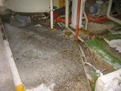 Zwaar aangetaste betonvloer door zwavelzuur